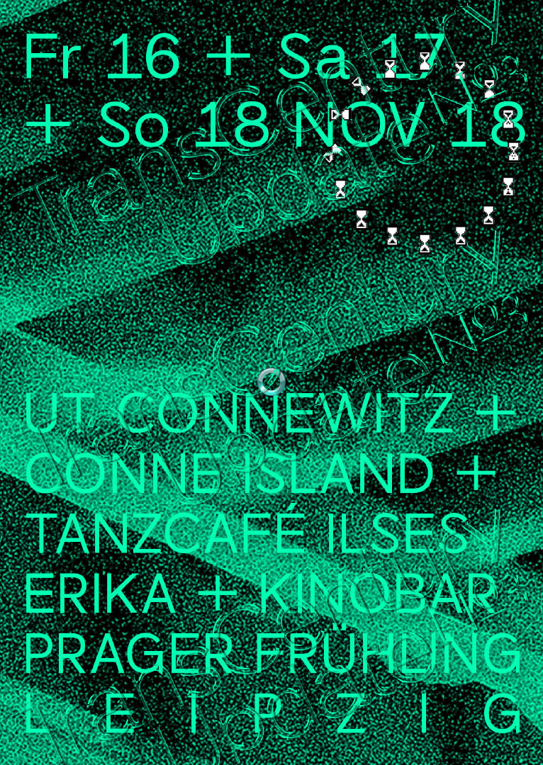 TransCentury Update N°3 public advertising graphics for Transcentury Update festival in Leipzig, taking place in UT Connewitz, Ilses Erika, Conne Island, Kinobar Prager Frühling and Schnellbuffet Süd